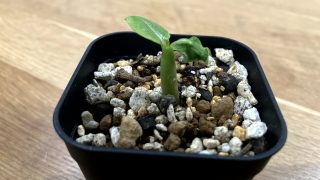 鉢上げして萎れてしまったアデニウムですが、何とか耐えています。少しずつ本葉も伸びてきているので枯れてはいないようです。このまま順調に育ってくれるといいんですが…
